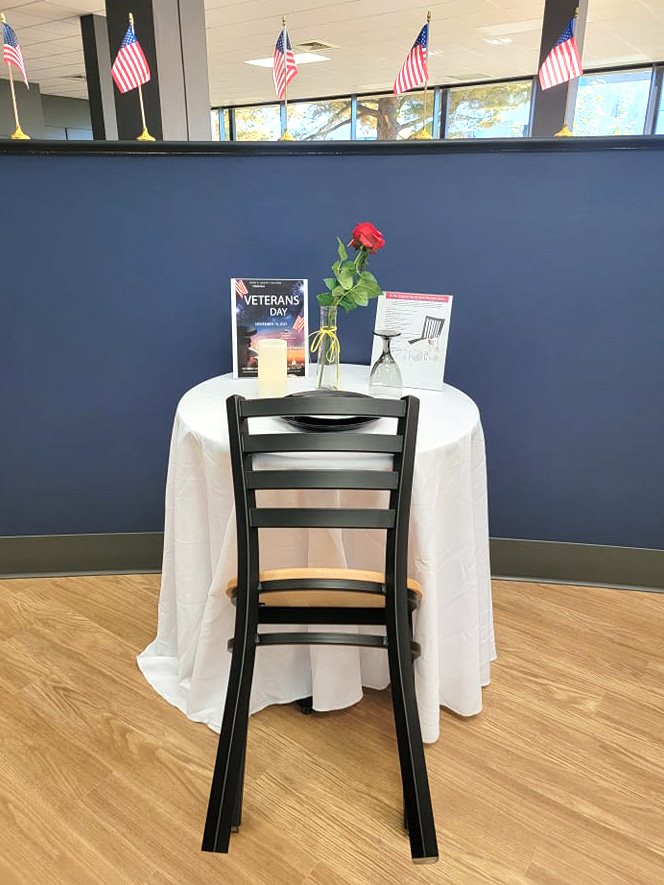 The Veteran’s Resource Office has also placed displays around campus that include a Missing Man Table in the Cafeteria and Honor Flight Thank You Cards at the E Wing Entrance. Thank you cards are given to the Veterans Honor Flight of Southern Illinois for mail calls. Veterans are taken on a one-day trip to Washington, DC, to visit war memorials. During the flight home, veterans participate in one of the best traditions in the military, mail call. Veterans are handed stacks of cards and letters from strangers, friends, and family. Thank you cards should be returned by Friday, November 12, 2021, to the Veteran’s Resource Office or at the box provided at the E wing entrance.